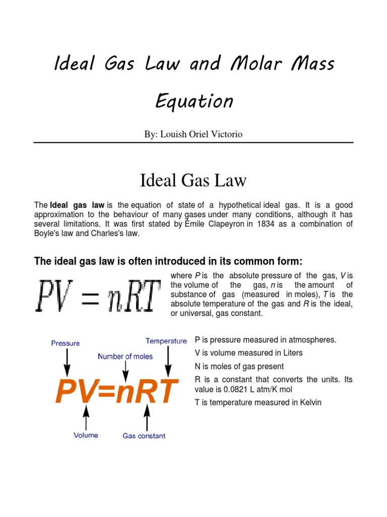 Pv = nrt , where n is the number of moles, and r is universal gas constant. The ideal gas law is a single equation which relates the pressure. Its value depends on the units used to express pressure and volume. Units for the gas constant vary, depending on other units used in the equation. Can have three different values. Honors chemistry chapter 11 page 1 chapter 11 molecular composition of gases ppt download / ideal gas law equation the ideal gas equation is given by:. Ideal gas law calculations pv=nrt tutorial with worked examples for chemistry students. These different relationships can be combined into a single relationship to make a more general gas law: The ideal gas law is the equation of state of an ideal gas (also known as a perfect gas) that relates its absolute pressure p to its absolute temperature t. This ideal gas law calculator is also known as a gas pressure calculator, a molar volume calculator or a gas volume calculator because you can use it to find different values. Table 6.1 values of the ideal gas law constant r lists the numerical values of r. Before we look at the ideal gas equation, let us state the four gas variables and one constant for a better understanding.the four gas variables are: The subscripts on k indicate that six different values would be obtained.